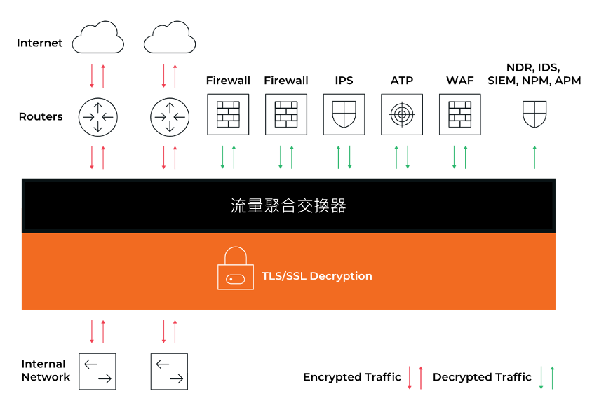 藉由解密SSL/TLS加密流量,使資安設備可檢查網路流量是否具惡意行為,顯著提高資安防禦與威脅偵測的能力。 - 優化監控工具效能